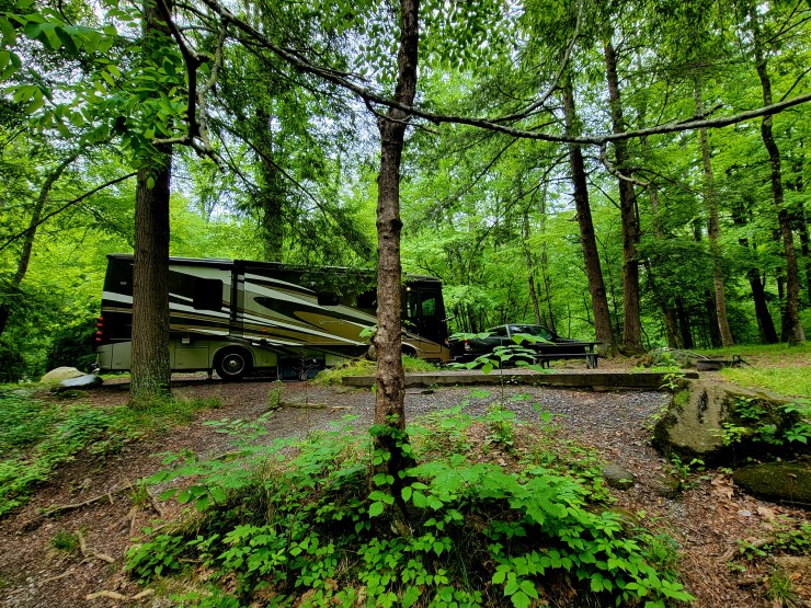 Elkmont Campground sits at an elevation of approximately 2,150 feet, making it an ideal base camp for exploring the treasures of the Great Smoky Mountains. The campground is easily accessible, located just off the Little River Road, and offers a range of amenities for visitors to enjoy. Whether you’re arriving in an RV, pitching a tent, or seeking solitude in the backcountry, Elkmont has the perfect spot for you. (NOTE: 35ft is the max length for a motorhome. Our Newmar barely fit.) Our site was right on the river and covered in trees. Our kind of campground!